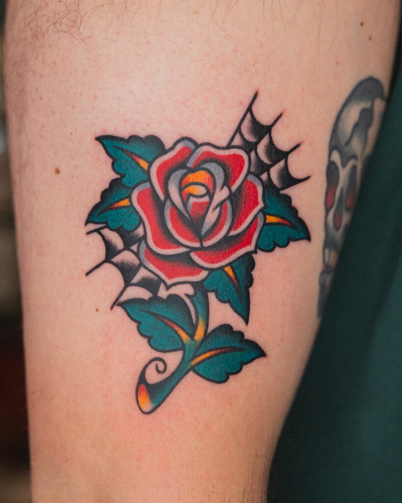 A flash combining the classic American Traditional motifs of a rose and a spider web.