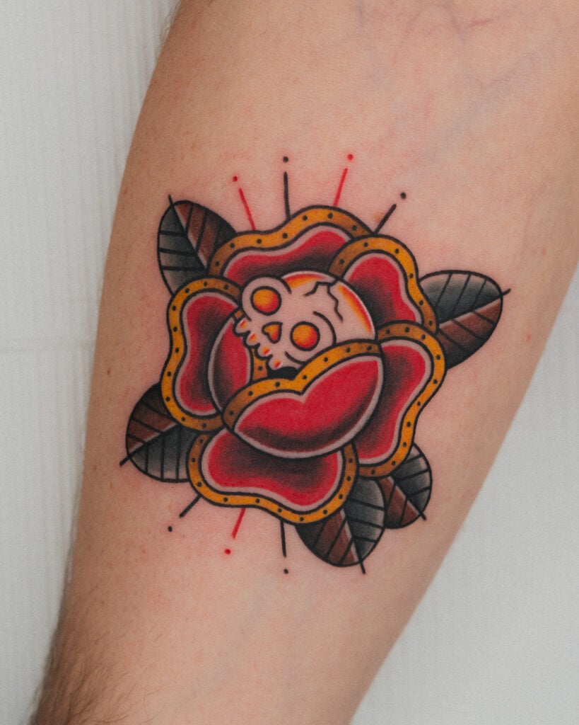 A flash combining a rose and skull illustrated in the American Traditional style. The vibrant red petals and the skull placed at the center create a pop and unique impression. Colored with a brown and gold palette, the design exudes a luxurious and elegant finish.