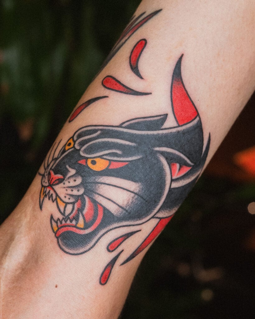 This flash features a panther bursting through a wound, illustrated in bold American Traditional style.