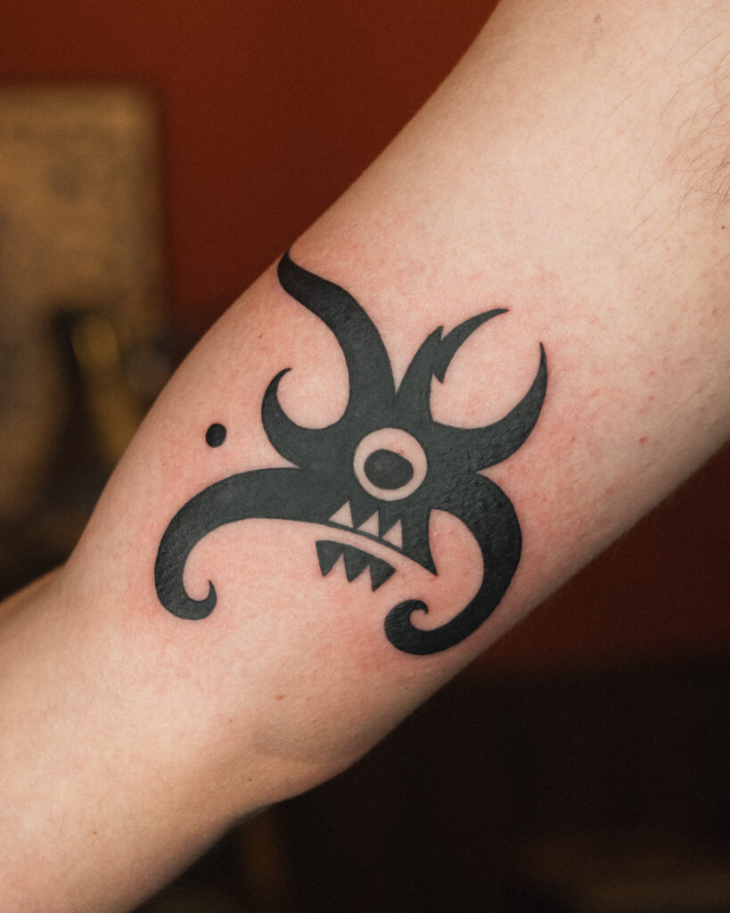 This Borneo tribal flash features a unique face-like motif that gives the design a distinct personality. The swirling curves and symmetrical composition create a bold visual impact, while elements resembling eyes and fangs enhance its character. A perfect choice for those seeking a tribal tattoo with a unique and unconventional twist.