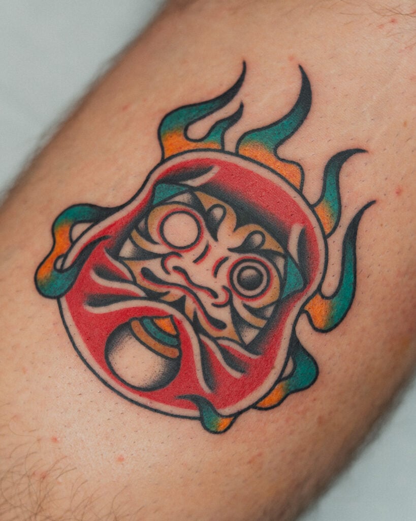 This Daruma design is rendered in the so-called “Japatra” style, where traditional Japanese motifs are depicted using American Traditional tattoo techniques.
