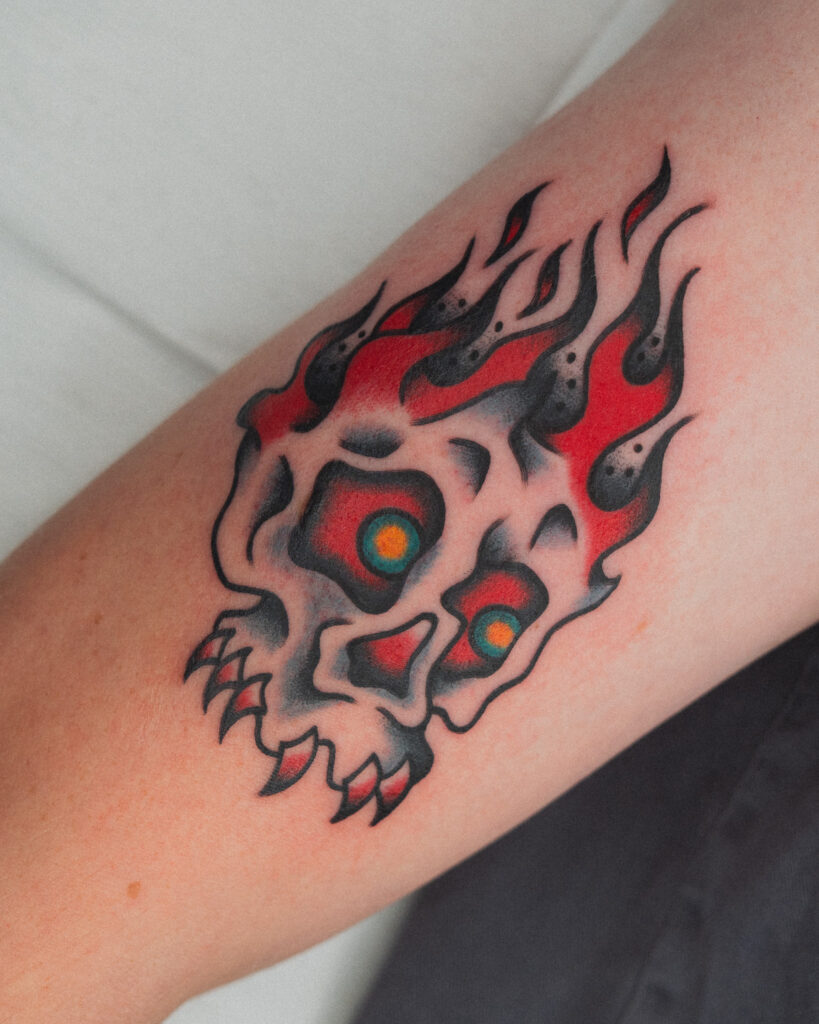 A playful take on the classic American Traditional skull motif, this flash features bold red flames and vibrant colors. The sharp silhouette and striking eyes give it a strong presence, making it a perfect one-point design that stands out on any placement.