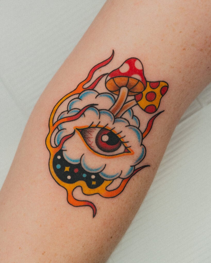 A flash tattoo featuring mushrooms, clouds, and an eye as its motifs.