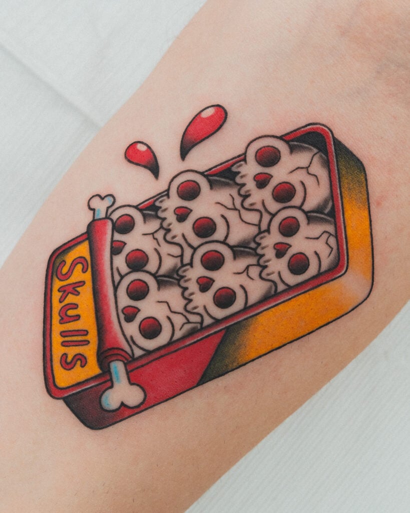 This flash design features a pop and surreal theme centered around a can filled with skulls. Packed tightly like oil sardines, the skulls are humorously illustrated with bold red and yellow contrasts, creating a playful yet eerie effect. With its striking visual impact, this unique piece is perfect for anyone looking for a bold and unconventional tattoo.