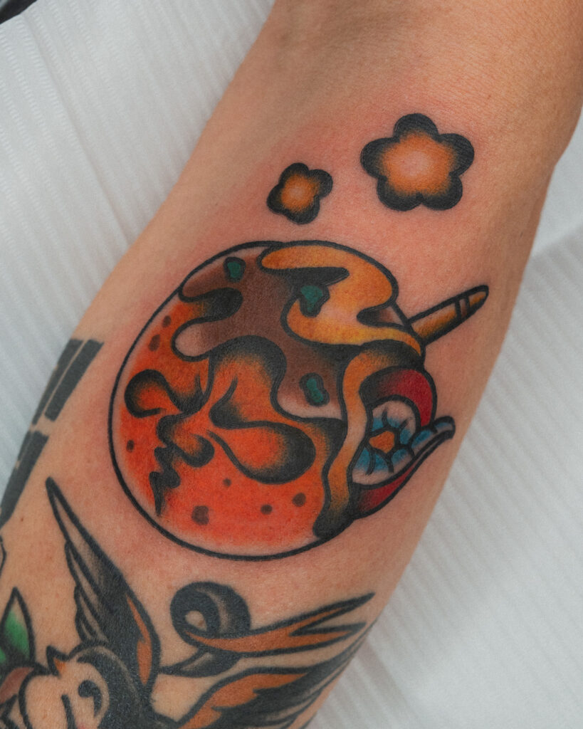 Based on the American Traditional style, this playful piece features humorous facial expressions and bold colors, giving it a fun and creative twist.