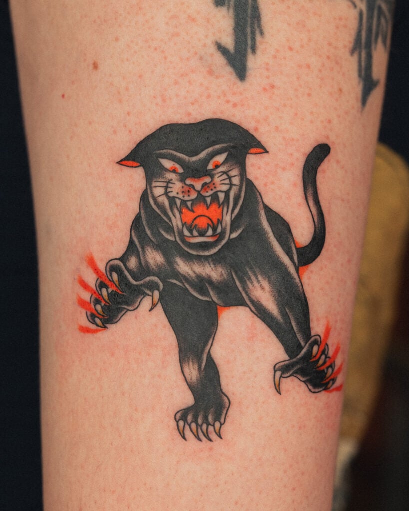 A panther flash illustrated in the classic American Traditional style.