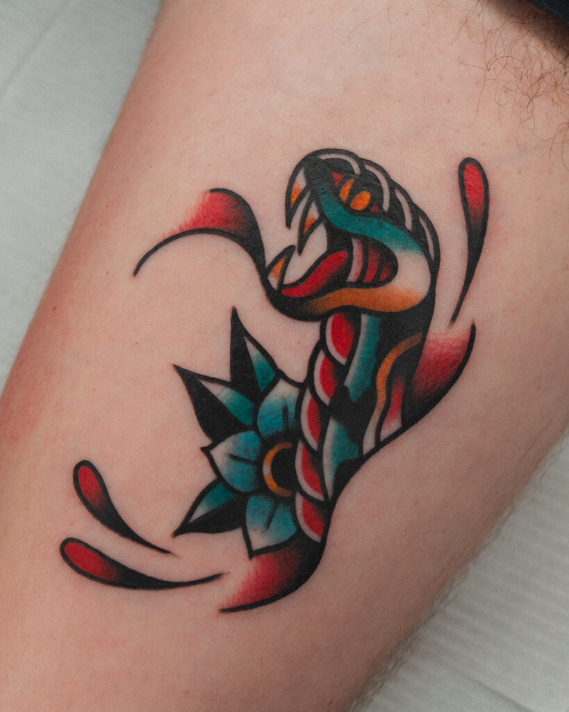 This snake flash features a striking composition that makes it appear as if the serpent is bursting through the skin. The classic color palette of red, green, and black is enhanced with bold shading, adding intensity and depth to the visual impact. While staying true to the traditional American style, the design stands out with its strong personality and unique flair.