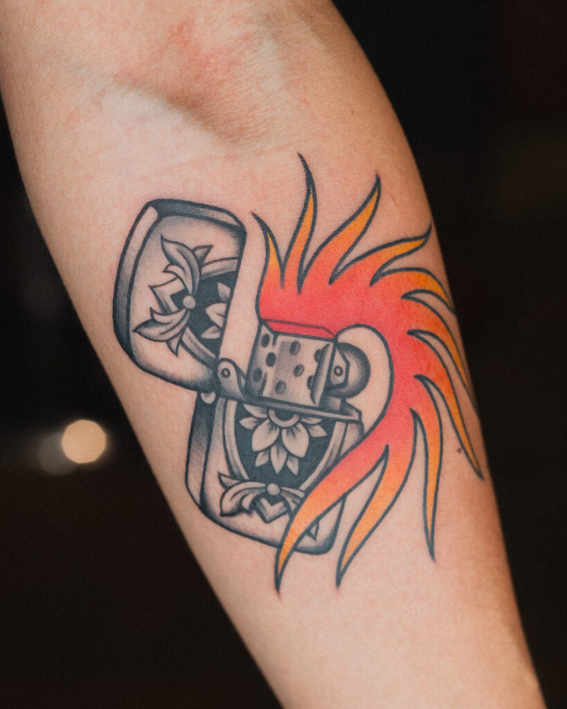 This flash features a Zippo lighter illustrated in bold American Traditional style.