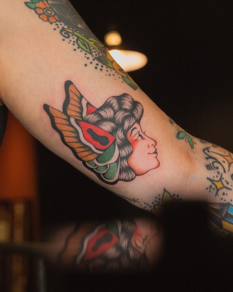 ネオトラディショナルスタイルで描かれた、ピンナップガールと蝶のモチーフを組み合わせた独創的なデザイン。