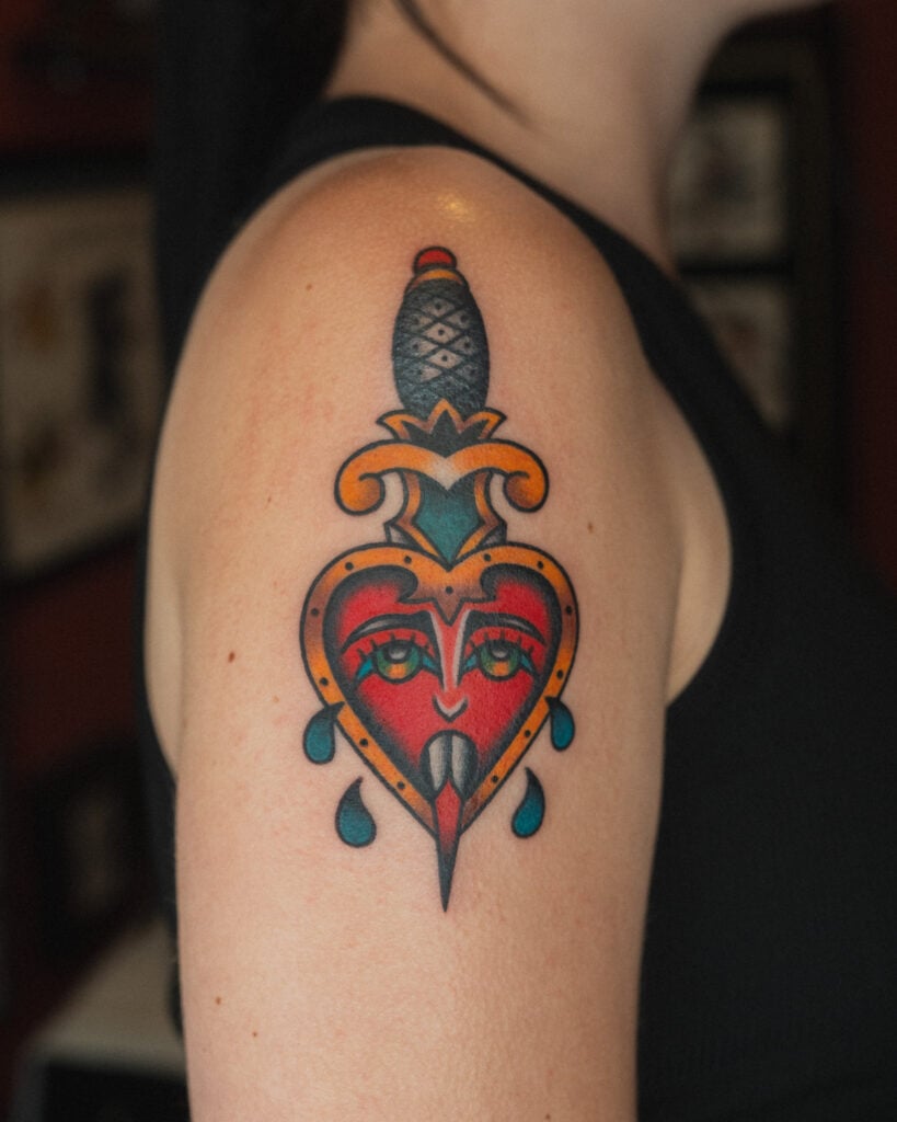 アメリカントラディショナルスタイルで描かれたダガーとクライングハートモチーフ融合にしたフラッシュ。