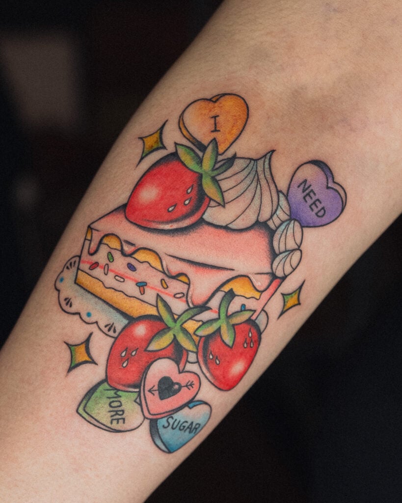 苺やホイップ、カラフルなハートのキャンディが組み合わさり、可愛らしいデザインに仕上がっています。