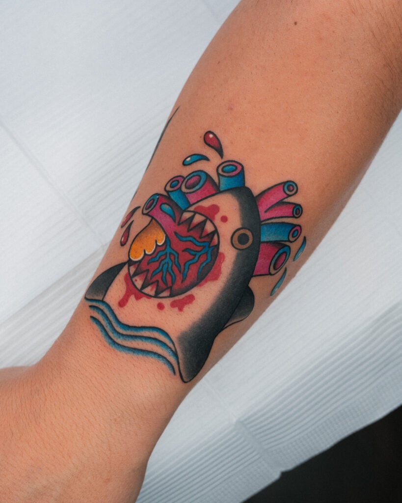 カラフルな血管と動脈がユニークな形状で描かれ、血飛沫や水しぶきの表現がデザインに躍動感を与えています。