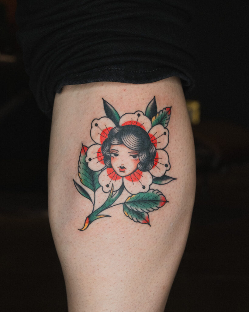 アメリカントラディショナルタトゥーでよく使われるトラッドフラワーの中央に、女の子の顔をあしらったユニークなフラッシュ。