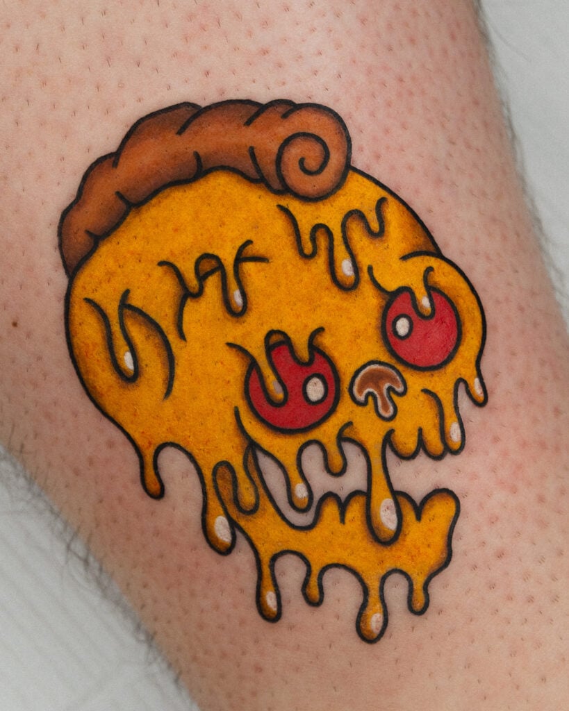アメリカンカルチャーで親しみ深い、ピザをメインのモチーフとした、スカルのタトゥーです。